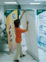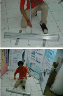 易拉寶拆裝教學▲返回 | 您拿到了易拉寶展示架在煩惱不會裝卸嗎?沒關係~看完愛鴻的這篇超簡易式圖解教學你就會了! | 組裝教學 | 步驟一: 旋轉腳架,使腳架與基座成90°  | 步驟二: 組裝伸展「三節支撐桿」  | 步驟三: 將「三節支撐桿」插入基座孔  | 步驟四: 雙手平均拉起海報卷軸,並升至與支撐桿同高  | 步驟五: 稍後傾斜整個海報架,以方便將海報扣掛在支撐桿上  | 注意: 將三節支撐桿插入基座孔時,要確實插入並含住基柱(黑色塑膠),否則整個海報架會前頃。  |